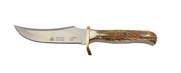 Puma’s SGB 6116393L Skinner is a fixed blade knife that features a 440A German stainless steel blade. The trailing point blade measures 5.25 in. and has a satin finish. The 4.375 in. handle is fitted with stag scales and a brass hand guard for comfortable and secure use. The knife comes with a leather sheath for safe and easy carry.