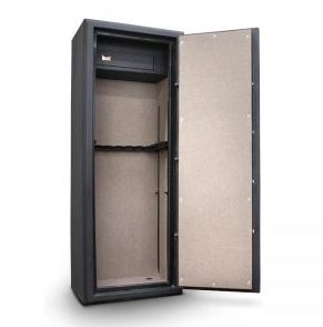SFABH Dimensions: 560W x 405D x 1500H Type: Up to 12 Gun Weight: 152kg Category: A B H Fire Resistant SafeSpika Keypad Lock FEATURES Spika digital lock with key override 6 live locking bolts Heat resistant for 30 mins at 540°C 6mm internal H compartment 2mm body 3mm door Taupe carpet lined interior Adjustable gun rack