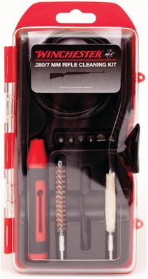 Twelve piece rifle cleaning kit contains: Red Winchester chase, hybrid multi-function handle, 33 inch pull rod, brush, mop, slot tip, solid brass jag, 25 patches, six-piece bit set (2 phillips, two flat heads, one star and one hex).