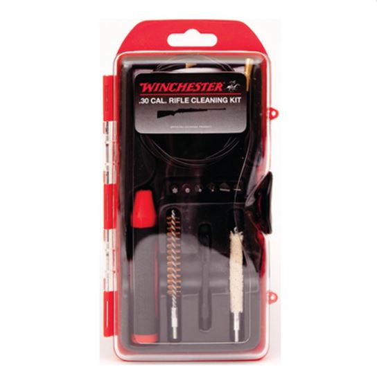Twelve piece rifle cleaning kit contains: Red Winchester chase, hybrid multi-function handle, 33 inch pull rod, brush, mop, slot tip, solid brass jag, 25 patches, six-piece bit set (2 phillips, two flat heads, one star and one hex).